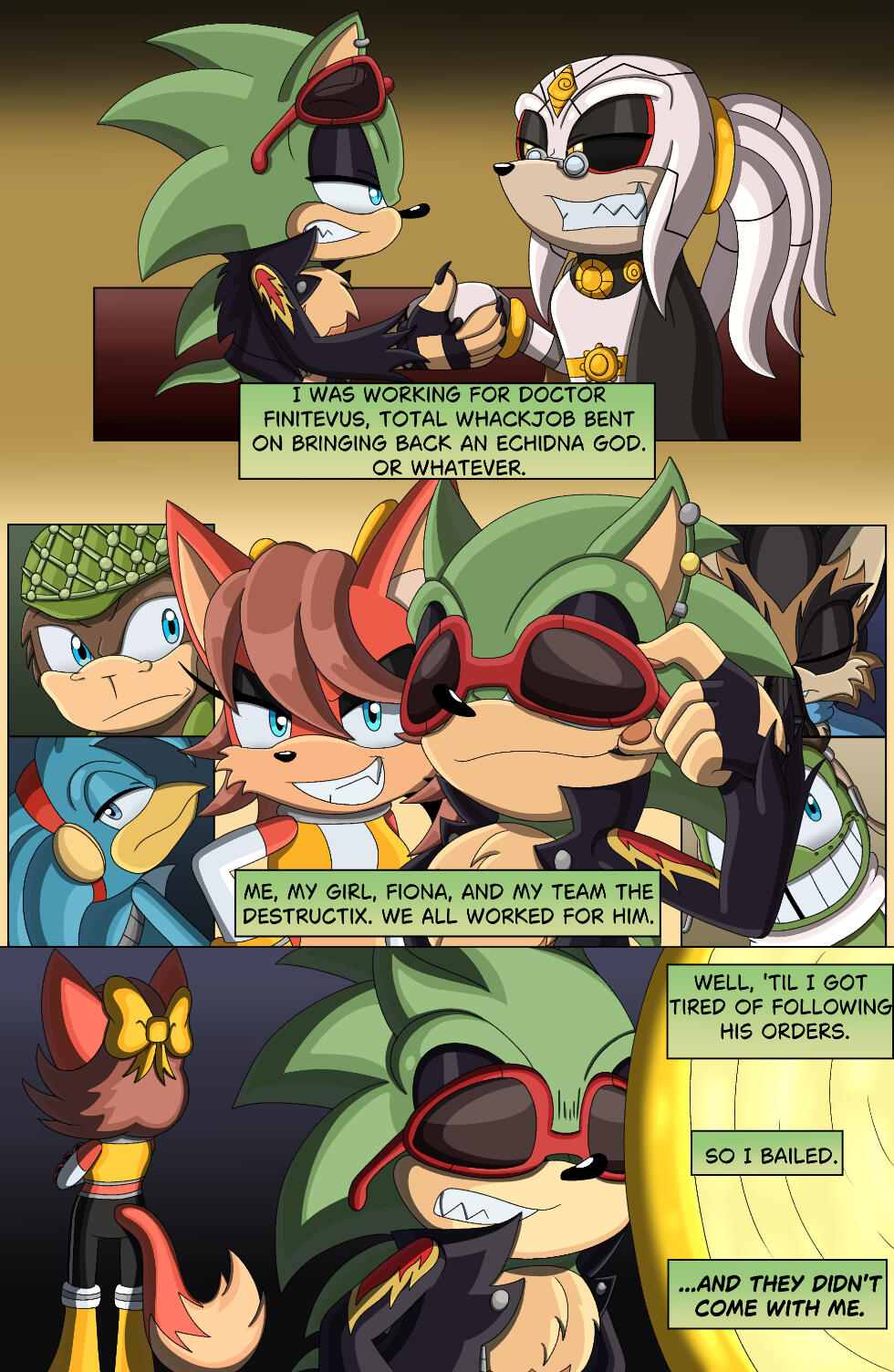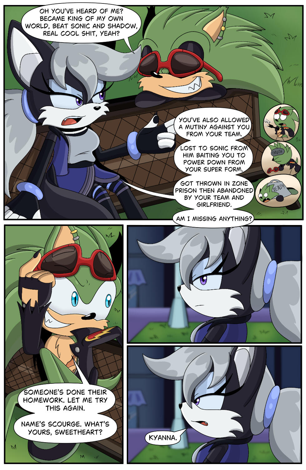 Scourge Redemption takes place after the events of Scourge Lockdown (Archie Sonic Universe Issues #29-32) and the Reboot Era of Archie Sonic (Issues #252 onward). It happens due to the Super Genesis Wave rewriting history as of the When Worlds Collide event (Sonic & Mega Man Event in Archie).Much like how Sonic remembers the old life and the new one, Scourge receives the same treatment due to being between worlds after his escape from Zone Prison. After the reboot of all of the worlds, Scourge's new life landed him in league with Doctor Finitevus along with his girlfriend, Fiona Fox and his team, The Destructix.However, after a while, he no longer wanted to work with the mad echidna and tried to leave with all of them. ...But Fiona and the Destructix feared the doctor and stayed. Scourge since then was left on his own. He became a loner, fighting with himself on wondering if he should continue his original plans...or continue being a nobody and fade into obscurity.Then...when he meets a new face, a fox woman named Kyanna, that is when his new life-his new story begins...Facts about the story: